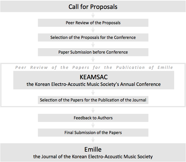 한국전자음악협회는 보다 다양한 분야의 연구를 독려하고 보다 우수한 연구결과를 지원하기 위해 이와 같은 과정을 시행합니다. 지원자의 연구 기획안이 훌륭한 논문으로 완성되는 과정을 함께 하며, 학술대회는 발표 논문이 다양한 참관자와 독자의 반응과 의견을 얻는 평가의 장이 되도록 합니다. 모든 심사 결정은 전문 평가단에 의해 이루어지며 동료 평가제를 실시합니다. 또한 전문 평가단이 각각 개별적으로 평가한 결과를 운영 위원이 수집하여 통계에 의해 독립적으로 결정합니다. 통계의 결과로 최종 결정이 어려운 경우 편집위원회 회의를 소집하여 충분한 논의를 거칩니다. 제안서 평가단은 각 논문 별 편집 위원회 중 임의의 3-6인으로 구성되며, 논문 평가는 각 논문 별 주제 친밀도를 조사한 후 그 정도가 가장 높은 2-4인으로 구성됩니다.